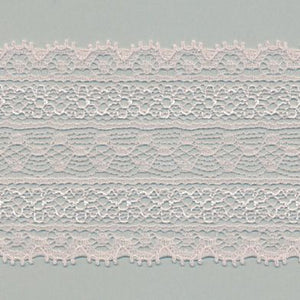 SHINDO社製(S.I.C.)ジャガードトリミングレースです。ラッセル織機で織られ、3種類の模様がレイヤー状になっているレースで、複雑かつ繊細な模様でも薄く平らなことも特徴の一つです。カジュアル衣料やダンス衣装、アンダーウエア、子供服、インテリア雑貨などのご用途向けにオススメです。また、染色や洗濯時の収縮を最小限に抑えるために、生成りを含む全てのカラーに防縮加工が施されておりますので、生地に縫い付けたレースが洗濯したらすごく縮んでしまった...(T_T) といった惨事を回避できます。※メートルカット品は、実物確認用のサンプルまたはご試作用途向けに販売をいたしております(数量「3」でお求めいただくと、3メートルを1本でお届け)。巻でのご購入前に必ずメートルカット品にて実物をご確認ください。