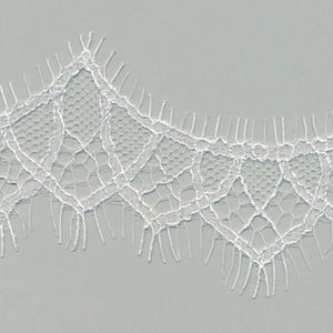 SHINDO社製(S.I.C.)リバートリミングレースです。緻密で細やかな柄行きとウエーブラインが特徴で、リバーレース織機は使用する糸数も多く、構造が複雑なため生産するには高い技術力が必要とされる技法の希少性の高いレースです。レディース衣料やダンス衣装、インテリアなどの雑貨向けのご用途にオススメです。また、染色や洗濯時の収縮を最小限に抑えるために、生成りを含む全てのカラーに防縮加工が施されておりますので、生地に縫い付けたレースが洗濯したらすごく縮んでしまった...(T_T) といった惨事を回避できます。※メートルカット品は、実物確認用のサンプルまたはご試作用途向けに販売をいたしております(数量「3」でお求めいただくと、3メートルを1本でお届け)。巻でのご購入前に必ずメートルカット品にて実物をご確認ください。