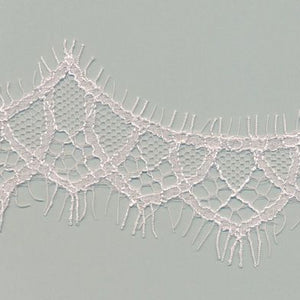 SHINDO社製(S.I.C.)リバートリミングレースです。緻密で細やかな柄行きとウエーブラインが特徴で、リバーレース織機は使用する糸数も多く、構造が複雑なため生産するには高い技術力が必要とされる技法の希少性の高いレースです。レディース衣料やダンス衣装、インテリアなどの雑貨向けのご用途にオススメです。また、染色や洗濯時の収縮を最小限に抑えるために、生成りを含む全てのカラーに防縮加工が施されておりますので、生地に縫い付けたレースが洗濯したらすごく縮んでしまった...(T_T) といった惨事を回避できます。※メートルカット品は、実物確認用のサンプルまたはご試作用途向けに販売をいたしております(数量「3」でお求めいただくと、3メートルを1本でお届け)。巻でのご購入前に必ずメートルカット品にて実物をご確認ください。