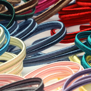 SHINDO社製(S.I.C.)レーヨン蛇腹です。レーヨン糸で作られており、光沢感がありしなやかな蛇腹コードで、ソウタシエブレードとしてのアクセサリー製作やライン装飾のご用途にオススメの資材です。※メートルカット品は、実物確認用のサンプルまたはご試作用途向けに販売をいたしております(数量「3」でお求めいただくと、3メートルを1本でお届け)。巻でのご購入前に必ずメートルカット品にて実物をご確認ください。