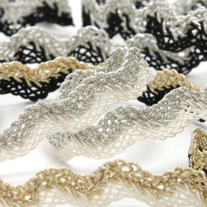 SHINDO社製(S.I.C.)メタリックトリミングブレードです。金糸/銀糸と白色/黒色が半々に配されている意匠性の高い山道テープで、シックで高級感があります。存在感もあり華やかですので、舞台衣装やドレスなどのアクセントとしてオススメです。※メートルカット品は、実物確認用のサンプルまたはご試作用途向けに販売をいたしております(数量「3」でお求めいただくと、3メートルを1本でお届け)。巻でのご購入前に必ずメートルカット品にて実物をご確認ください。
