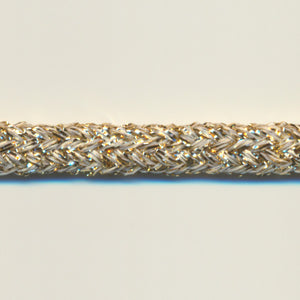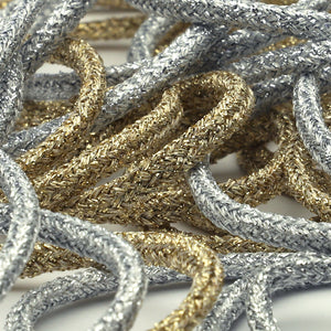 • SHINDO社製(S.I.C.)メタリックトリミングブレードです。芯糸にギッシリとラメを巻きつけるのではなく、あえて白い地色を少し見せるように作ったラメ糸を使用し、ラメ感を少し抑えめにした丸紐です。ラメ糸を使用しているにもかかわらず、柔らかめに仕上がりますので、使い勝手や使用感が良く、またカジュアルな用途にも相性が良くなります。存在感もあり華やかですので、舞台衣装やドレス、アクセサリーなどのアクセント使いにオススメです。※メートルカット品は、実物確認用のサンプルまたはご試作用途向けに販売をいたしております(数量「3」でお求めいただくと、3メートルを1本でお届け)。巻でのご購入前に必ずメートルカット品にて実物をご確認ください。