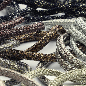 • SHINDO社製(S.I.C.)アンティークメタリックスピンドルコードです。繊細で奥深いアンティーク調のメタリック感とシックなカラーが特徴の丸紐で、パーカーのフード紐やスウェットパンツのウェスト紐、袋物の絞り紐などの衣料品や雑貨向けのご用途にオススメです。※メートルカット品は、実物確認用のサンプルまたはご試作用途向けに販売をいたしております(数量「3」でお求めいただくと、3メートルを1本でお届け)。巻でのご購入前に必ずメートルカット品にて実物をご確認ください。
