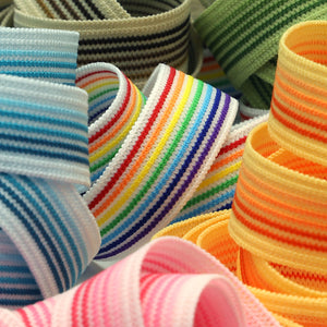 SHINDO社製(S.I.C.)グラデーションストレッチテープです。ストレッチのニットテープをベースに、同色グラデーションライン(C/#08のみレインボーカラー)がアクセントになっているテープです。子供服では女子のシャツのギャザー取りするゴムとして、男子下着の縁やウェストゴムとしても多くご採用いただいております。スポーツ、アパレル問わずに様々のご用途にオススメの資材です。12x12mmサイズはバインダー(テープ中央部に折れ目加工が施されており、袖や裾部分などの布端を容易に挟み込み、縁取りテープとして簡単&綺麗に縫い付けられるテープ)タイプです。※メートルカット品は、実物確認用のサンプルまたはご試作用途向けに販売をいたしております(数量「3」でお求めいただくと、3メートルを1本でお届け)。巻でのご購入前に必ずメートルカット品にて実物をご確認ください。