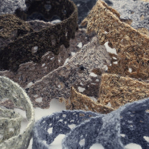 SHINDO社製(S.I.C.)メランジュトーションレースです。コットンの優しい風合いと粗野な麻素材の黒綿が杢調にミックスされた、素朴で奥行きのある表情のメランジュ(杢調)レースで、インテリアや雑貨向けのご用途におススメの資材です。また、染色や洗濯時の収縮を最小限に抑えるために、生成りを含む全てのカラーに防縮加工が施されておりますので、生地に縫い付けたレースが洗濯したらすごく縮んでしまった...(T_T) といった惨事を回避できます。※メートルカット品は、実物確認用のサンプルまたはご試作用途向けに販売をいたしております(数量「3」でお求めいただくと、3メートルを1本でお届け)。巻でのご購入前に必ずメートルカット品にて実物をご確認ください。
