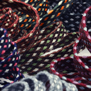 SHINDO社製(S.I.C.)チェックスピンドルです。アクリルの紐に薄くシリコーンコーティングを施したチェック柄の平紐で、見た目は蝋引き(ロービキ)紐のようですが蝋引き紐と違い物性が良く、洗濯することが可能なことも本製品の特徴の一つです。アクセサリーコードやループタイ(ボウタイ)、帽子の装飾などのご用途にオススメです。※メートルカット品は、実物確認用のサンプルまたはご試作用途向けに販売をいたしております(数量「3」でお求めいただくと、3メートルを1本でお届け)。巻でのご購入前に必ずメートルカット品にて実物をご確認ください。