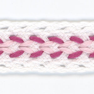 SHINDO社製(S.I.C.)ミックスカラーブレードです。天然繊維の綿100%で作られた温かみのあるナチュラルテイストのブレードで、ハンドメイド風にざっくりと編まれたテープ中央に2色のカラーステッチがアクセントになっています。インテリアや小物、雑貨向けのご用途などにオススメの服飾資材です。※メートルカット品は、実物確認用のサンプルまたはご試作用途向けに販売をいたしております(数量「3」でお求めいただくと、3メートルを1本でお届け)。巻でのご購入前に必ずメートルカット品にて実物をご確認ください。