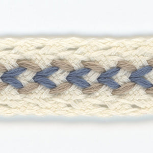 SHINDO社製(S.I.C.)ミックスカラーブレードです。天然繊維の綿100%で作られた温かみのあるナチュラルテイストのブレードで、ハンドメイド風にざっくりと編まれたテープ中央に2色のカラーステッチがアクセントになっています。インテリアや小物、雑貨向けのご用途などにオススメの服飾資材です。※メートルカット品は、実物確認用のサンプルまたはご試作用途向けに販売をいたしております(数量「3」でお求めいただくと、3メートルを1本でお届け)。巻でのご購入前に必ずメートルカット品にて実物をご確認ください。
