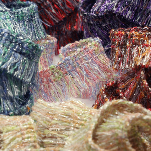 • SHINDO社製(S.I.C.)マルチカラーラメフリンジです。リング糸を使った意匠糸でかすり調を表現し、ラメをアクセントにしたフリンジになります。フリンジ部分を短くしている(約8mm)ため、ちょっとしたアクセント部分での使用も可能です。ツイード生地をほどいた様にも見えることからツイード生地との相性も良く、インテリアや小物雑貨向けのご用途にオススメです。※メートルカット品は、実物確認用のサンプルまたはご試作用途向けに販売をいたしております(数量「3」でお求めいただくと、3メートルを1本でお届け)。巻でのご購入前に必ずメートルカット品にて実物をご確認ください。