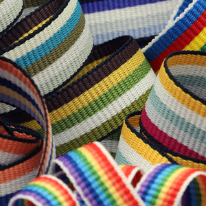 SHINDO社製(S.I.C.)レインボーストライプグログランリボンです。定番のレインボー(7色ストライプ)やエスニックテイストなカラー配色(5色ストライプ)のグログランリボンで、子ども服やカジュアル衣料、帽子やバッグなどの雑貨用途向けにオススメです。※メートルカット品は、実物確認用のサンプルまたはご試作用途向けに販売をいたしております(数量「3」でお求めいただくと、3メートルを1本でお届け)。巻でのご購入前に必ずメートルカット品にて実物をご確認ください。