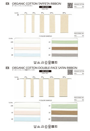 SHINDO社製(S.I.C.)のオーガニックコットンタフタリボン(SIC-232)とオーガニックコットン杉綾リボン(SIC-233)、オーガニックコットン両面サテンリボン(SIC-234)、メオーガニックコットン杉綾リボン(SIC-235)、オーガニックコットン山道テープ(SIC-9607)の実物サンプル帳です。